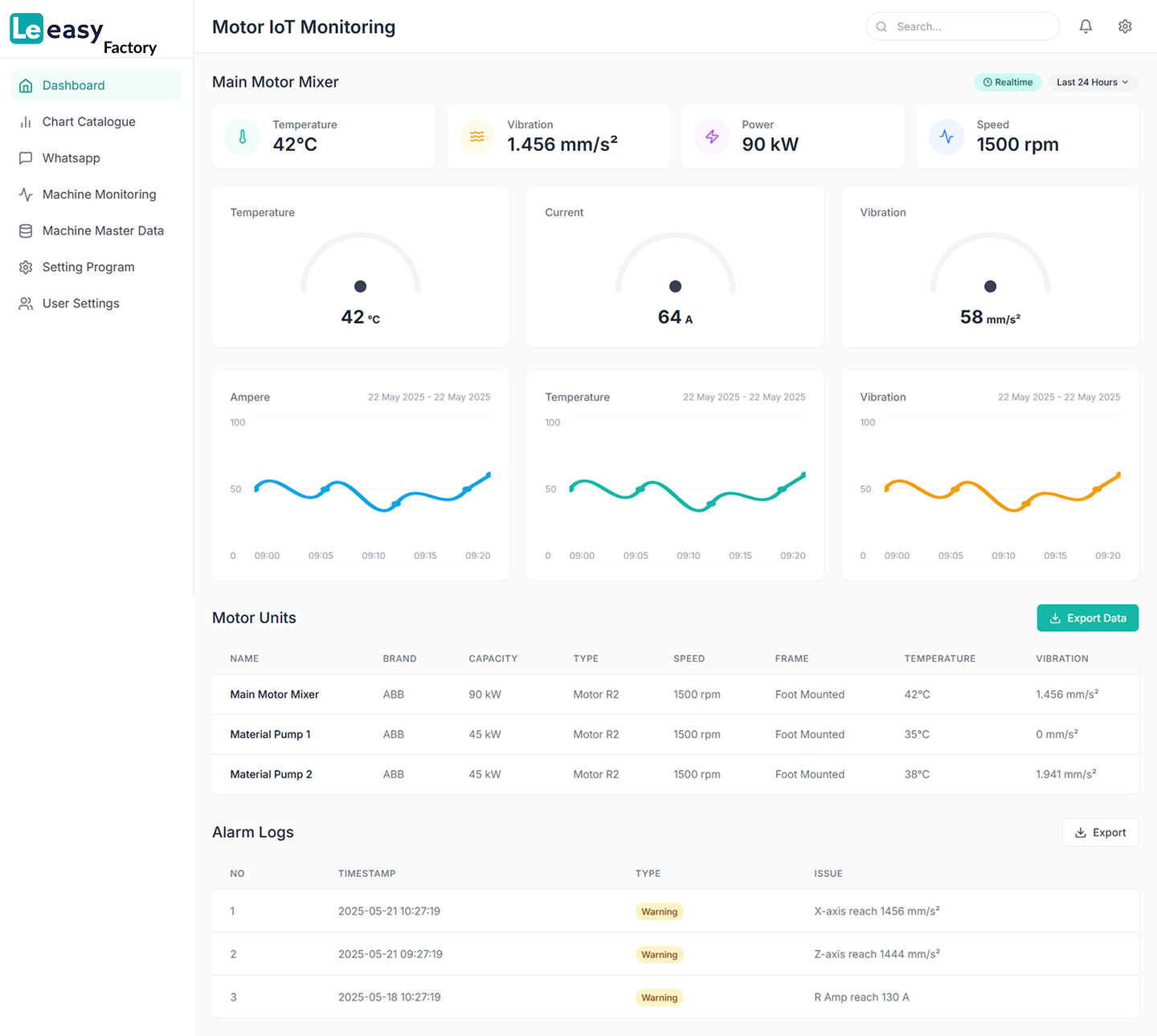 - 🔹Realtime Monitoring Panel: Pantau suhu, getaran, arus, dan RPM langsung dari sensor — kapan saja, di mana saja.